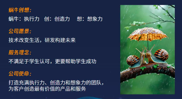 作为一家以IT培训起家的公司,我认为我们在当今有先天优势,当然也有先天不足。其实蜗牛创想这家公司,所经营的业务的核心是什么?你不妨把我们的战略倒过来看,“人才+科技+教育+AI”,我认为我们的核心就是培养人才,这是我们的优势,也有可能成为限制我们发展的瓶颈,能不能突破,就需要这个团队有没有魄力,很显然,我们有这个魄力。