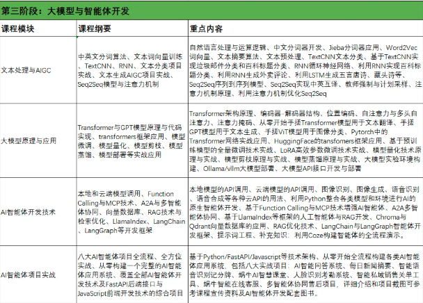 我们不仅以AI来驱动课程体系的更新迭代,也自研AI产品,过程中积累了很多经验,也有独立的研发公司承接各类AI开发类项目,这才是我们得以保持竞争优势的核心所在。AI智能体开发其实还是AI应用类产品,其技术原理本身并不难理解,谁都可以学习,其实难的在于企业级应用场景的落地。当今的AI仍然还是一个概率模型,很难做到100%,但是一个企业级应用,必须要确保AI的概率问题不能影响到业务运转,所以此时,我们的优势就体现出来了。不仅要有研发经验,同时也要对AI的底层原理有深刻的理解,否则项目上出现问题,你都不知道应该怎么优化。