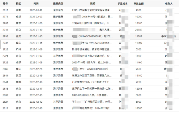 比如有类似这样的说辞,他们就是教学质量差,招不到人,才用这种手段欺骗你们这些年轻人。或者说交了的钱你觉得还有谁会退给你,不要天真了,他们可以用无数种手段让你无法退到钱,你见过哪个大学,收了的学费还会退给你的吗?诸如此类,不一而足,我不想阐述太多,下面这张图是我从我们的运营系统里面随便截取的一个退费清单,大家自行判断。